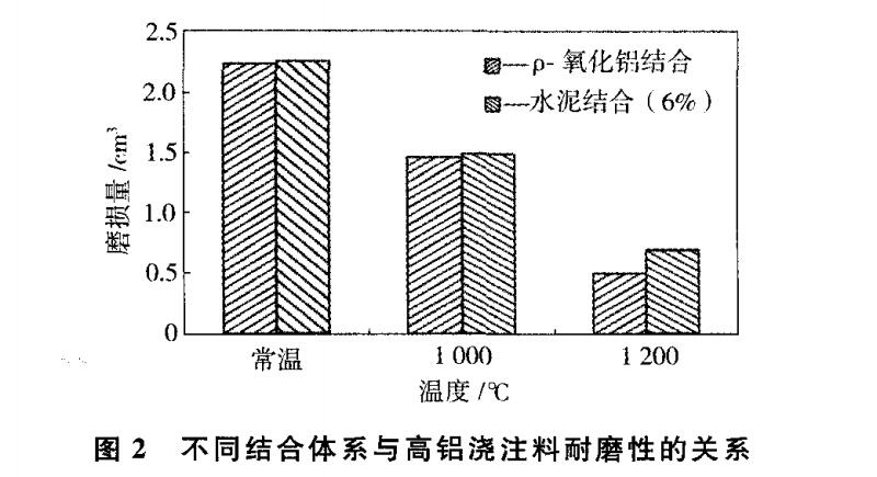 为了进一步比较低水泥结合和无水泥结合高铝浇注料的高温耐磨性能,选用微粉代替 Secar71水泥(加入量为6%)作结合剂进行了高温耐磨性试验。图2为不同结合体系与高铝浇注料高温耐磨性的关系。由图2可看出,材料在各试验温度下的耐磨性差别较小,但在高温(1200℃)条件下,无水泥浇注料的耐磨性稍好一些。这可能是由于ρ-AL2O3微粉结合的高铝质浇注料在1200℃时产生的玻璃相相对较少,从而使其具有较高的强度。