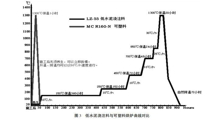 可塑料适合一年四季施工,在施工后无须养护,以立即升温,烘炉升温速度为50 ℃/h,一般24 h 即可达到生产操作所要求的炉温,大大缩短了烘炉时间,减少了烘炉费用。而浇注料在施工后需要等待固化、养生、漫长的烘炉过程,且不适合在冬季施工,必须注意防冻。浇注料和可塑料的烘炉曲线对比见图。