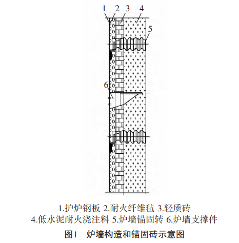 炉衬由耐火纤维毡、硅钙板(或轻质保温砖)及低水泥耐火浇注料组成。耐火纤维毡紧靠炉壳安放或放置在轻质砖与低水泥耐火浇注料衬之间。钢筋拉杆用的固定件厚壁钢管必须与炉壳钢板焊接牢固。锚固砖长度应与炉墙总体厚度相配套,以满足施工要求。锚固砖通过钢筋拉杆与炉壳连接,且为活动式,锚固砖冷端面与炉壳间距应≥40 mm,这样可随着炉墙的涨落而上下移动,也能随着炉墙的涨缩而 左右移动,保证了炉墙的稳定和使用寿命。