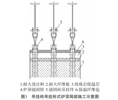 炉顶衬体材料与炉墙材料基本相同,也是由轻、 重质耐火材料配合使用,厚度分别为50~150 mm和 200~300 mm。图3为吊挂砖吊挂形式的炉顶局部施工 示意图。吊挂砖一般为直线形布置,其中心距为300~ 350 mm。高温部位吊挂砖中心距采用下限,反之则采 用上限,这样可以减少炉顶锚固砖顶面及周围散热损失。遇到孔洞时,允许布置成梅花形状。炉顶四周 的吊挂中心线,应与炉墙工作面保持一定距离。