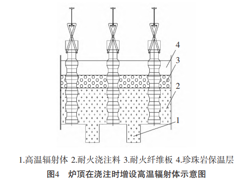 为增强炉顶辐射换热及减少炉顶散热损失,在 浇筑炉顶时,采用异形模板的方式进行整体浇筑,在 浇筑炉顶部位直接形成高温辐射体[1],具体详见图4。 此方式解决了在已形成的浇筑炉顶上打孔悬挂高温 辐射体脱落问题,同时将重质浇注料厚度由原来的 230 mm优化为200 mm,并增加其保温层厚度,减少 炉顶散热损失。