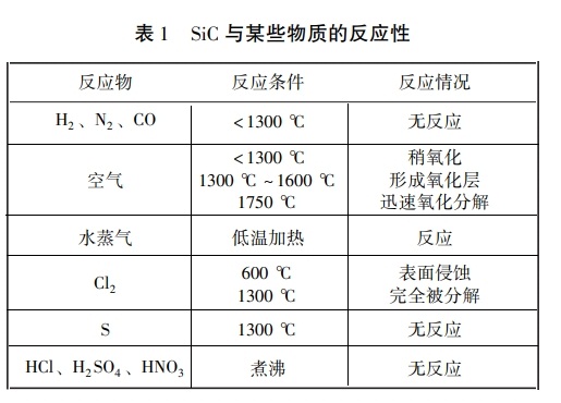 碳化硅( SiC) 具有极好的耐磨及抗高温性能, 可以用作磨具的磨料和耐火材料。 碳化硅作为耐火材料常用作冶炼行业的高炉衬里和航天的火箭喷口。 碳化硅耐火材料使用温度一般为 1400 ℃~ 1600 ℃ , 其具有优异的耐酸性和耐磨性能, 高温下强度高、热膨胀系数小、导热性强、抗热冲击性强、热震稳定性好。SiC与某些物质的反应性见表 1